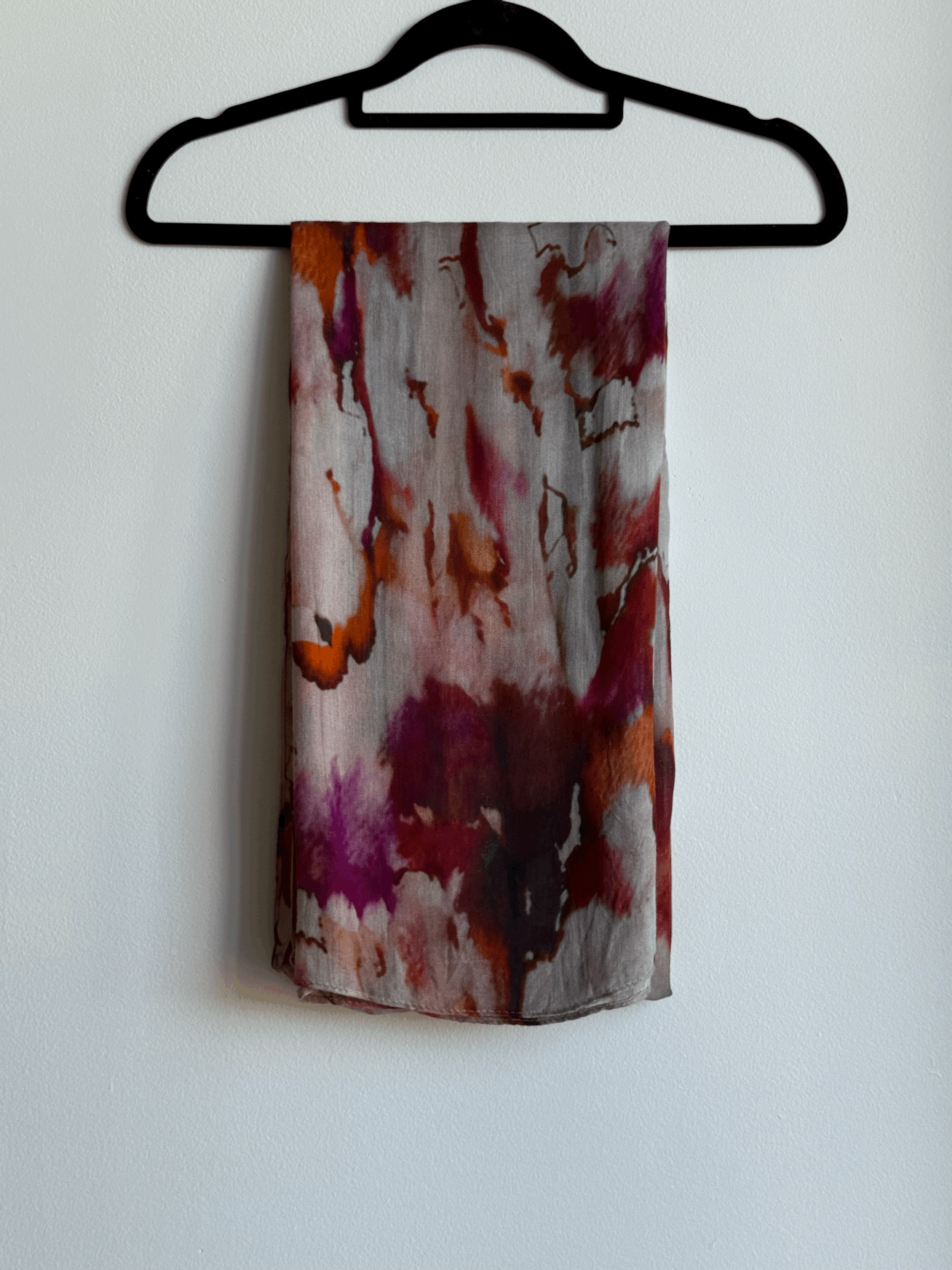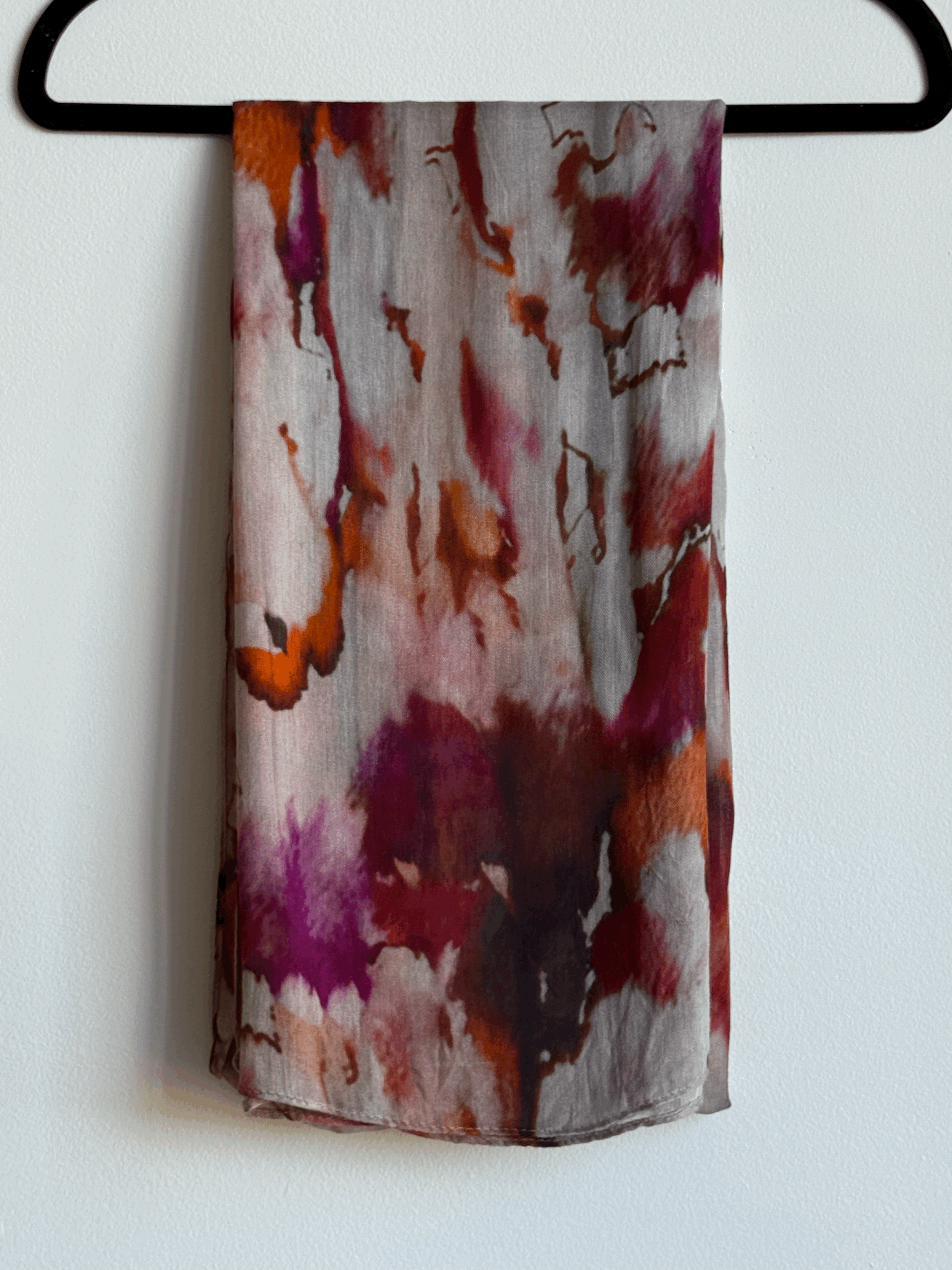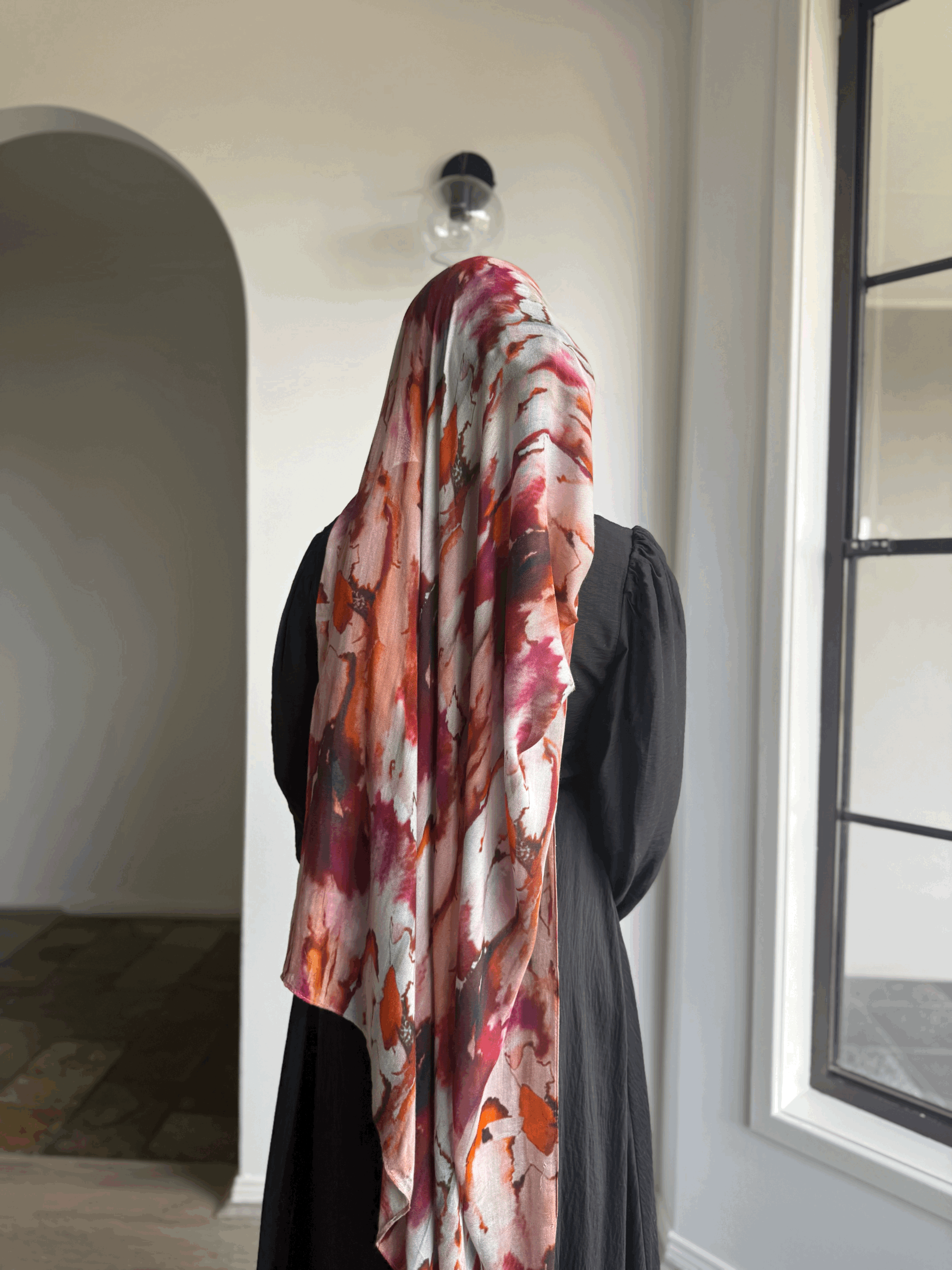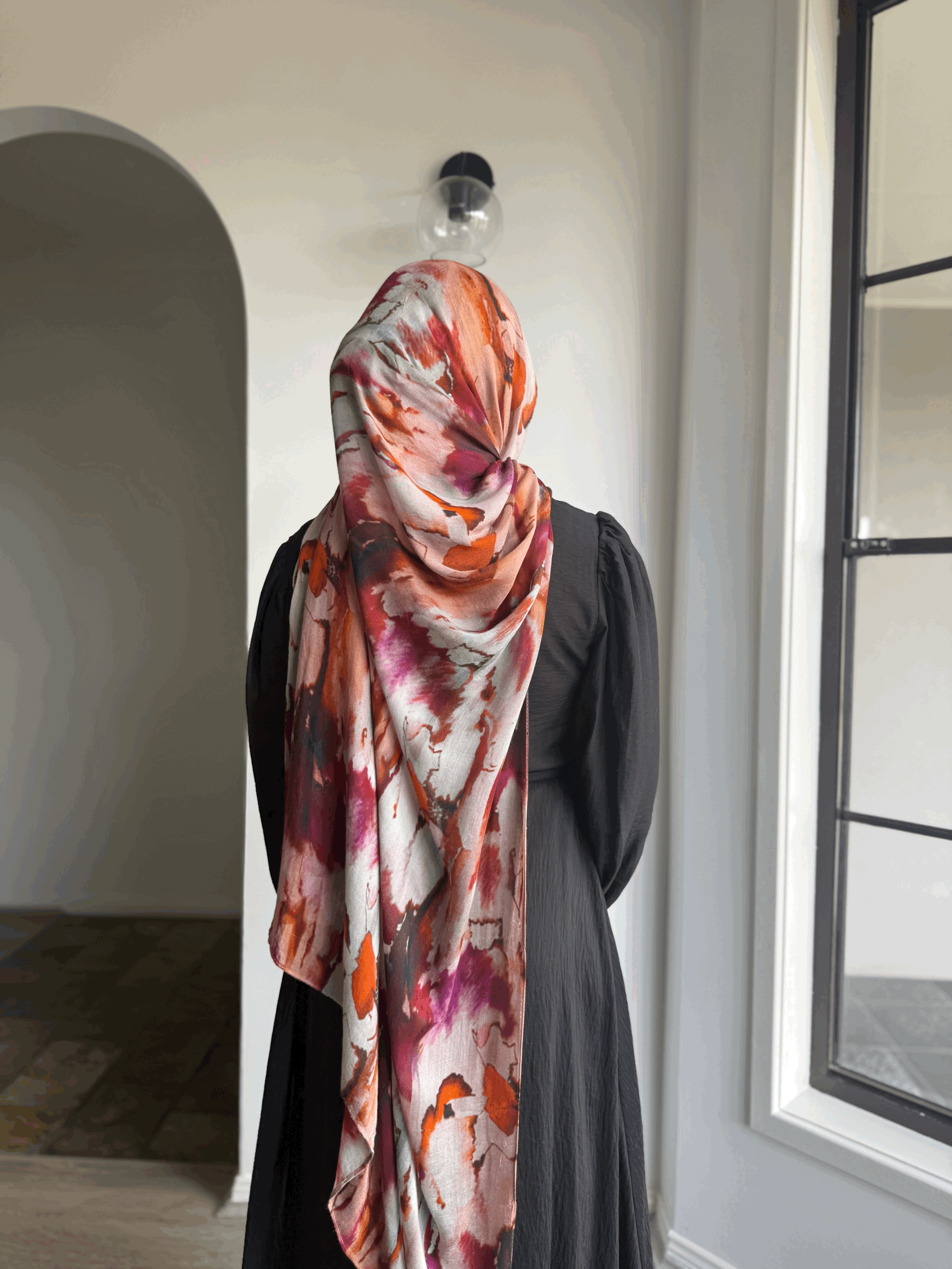 This hijab is a statement of effortless sophistication, blending light grey, maroon, orange, and purple in a harmonious and eye-catching mix.